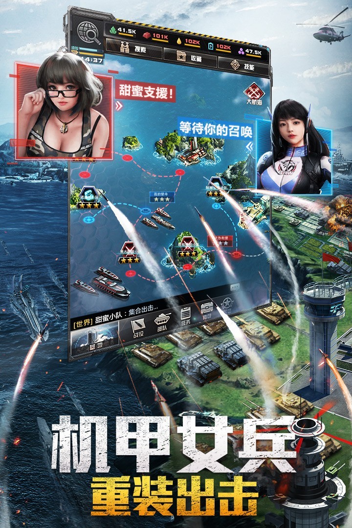 特色玩法航母编队系统,游戏利用航母搭载部队将陆、海、空完美结合。你的部队将由航空母舰运载,并将在世界各地旅行。在游戏中,航母不仅仅是航母,它还有很多主动技能,比如舰载机、战列舰等。,而且很多被动技能可以增加各种属性。灵活运用航母搭配不同兵种,