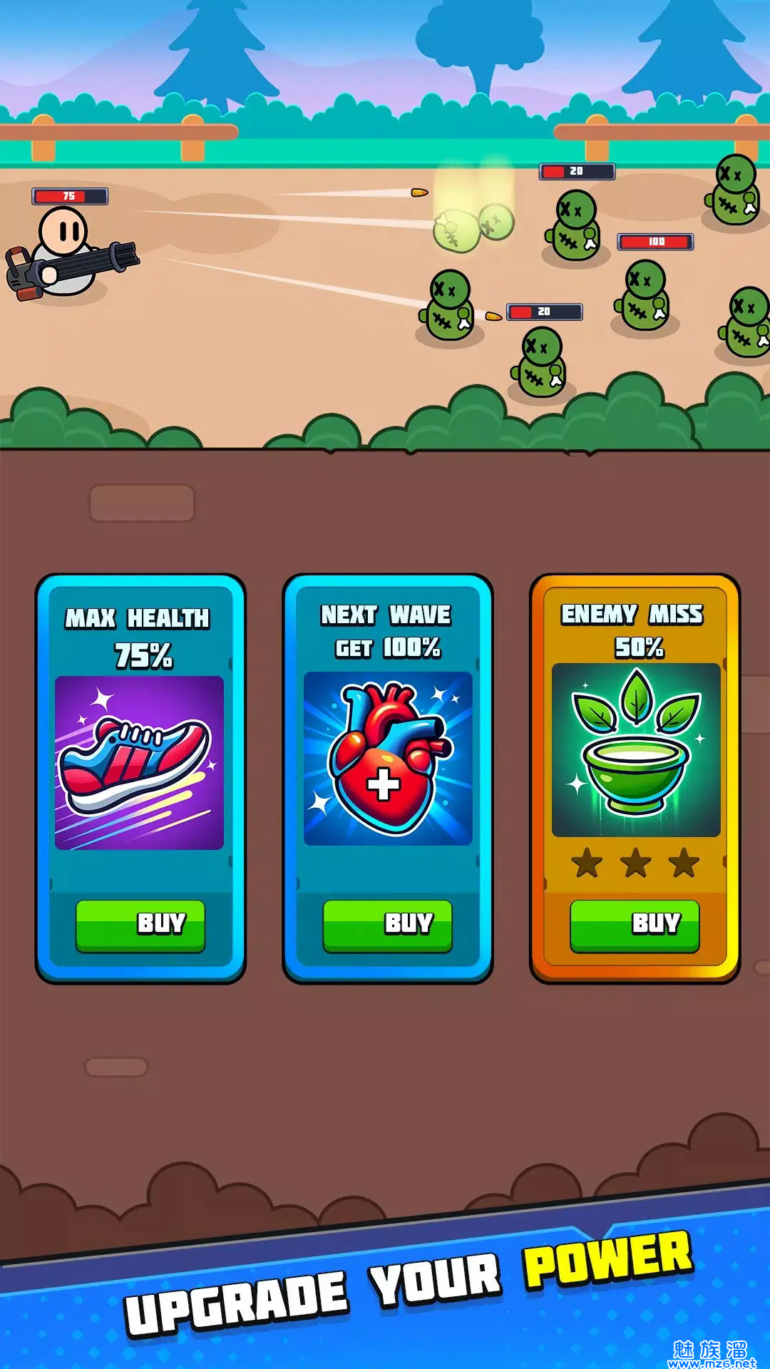 组合强化道具,提高射速,在一波又一波的僵尸压倒你之前将其击倒。