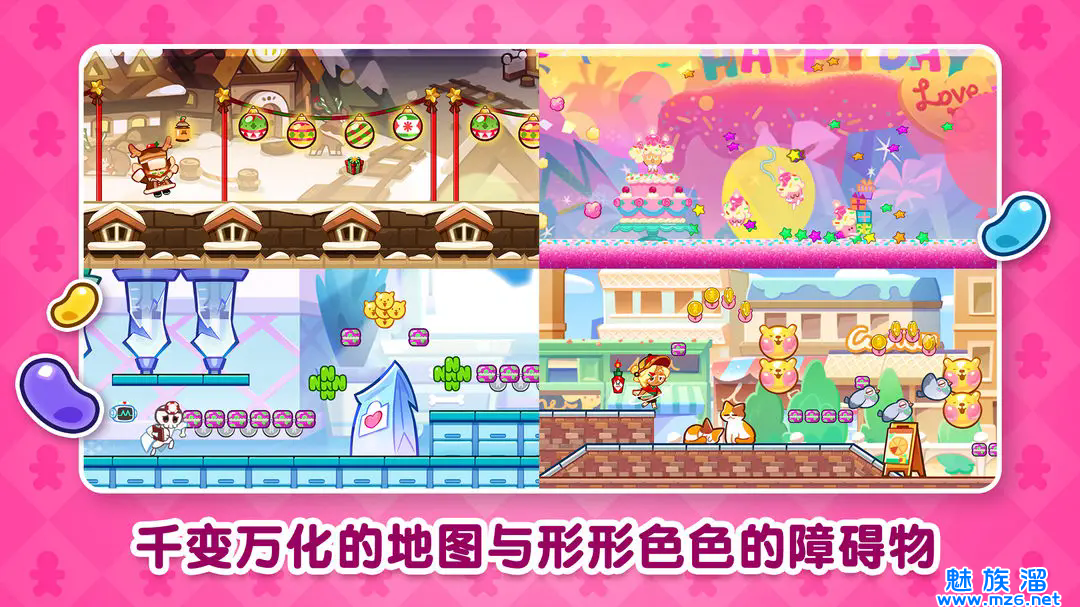 1、每天与可爱的饼乾们尽情地跑、跳、滑垒吧!数十种贱萌小饼干。