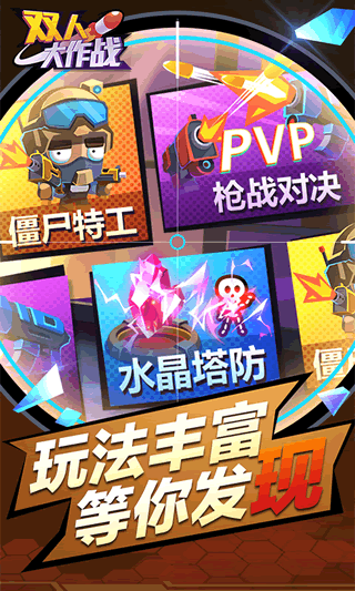 双人大作战2手机版是款玩法刺激的动作射击游戏。游戏支持多人联机组队,相互搭配做任务,感受非常刺激的竞技方式。所有的枪械道具都是免费的,还有僵尸特工、枪战对决和水晶塔防等模式可以挑战,让玩家无限作战pk,沉浸式作战对决,玩起来非常有趣哦。
