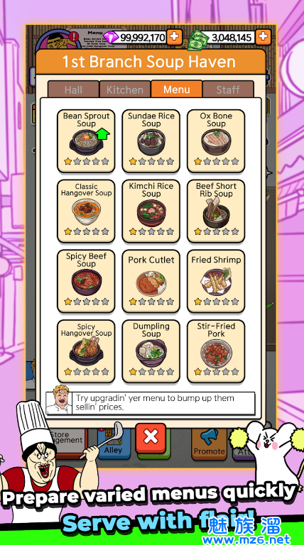5、卡通风格的图画和活泼的人物设计,让您享受餐厅经营的乐趣。