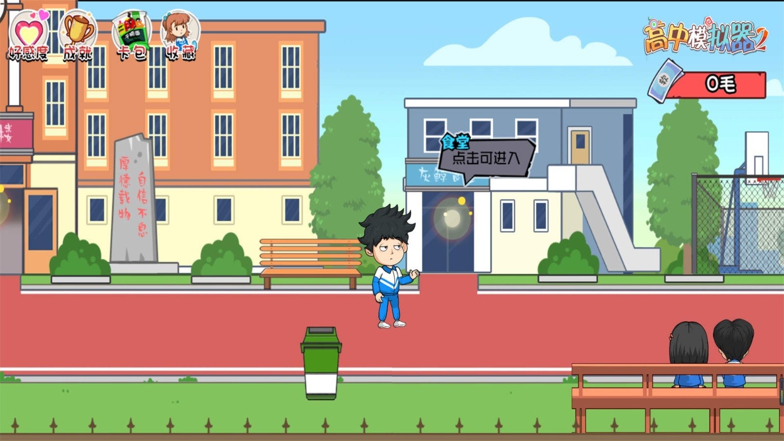 高中生的一天是一款非常温馨治愈的休闲闯关小游戏,游戏将会把玩家带回青春校园中,玩家将会扮演一名普通的学生,在校园中体验军训、学习、社交等各种玩法,玩家还可以通过自己的超能力,向自己的学长、学姐们抛媚眼,解锁更多的恋爱玩法。