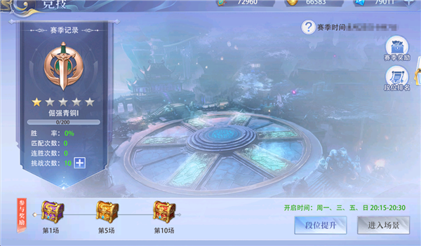 3、对决结束会获得战绩,战绩达到一定值可提升段位,参与战绩达到一定值可获得参与奖励。4、每个赛季将根据段位给予对应的段位奖励,若玩家排名在跨服前30名,则会获得排行奖励。