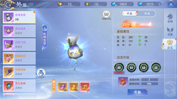 可通过商店和日常活动获得法宝进阶丹,可以升级法宝。