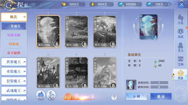 图鉴收集:可在仙关副本及护送中获得大量图鉴,激活图鉴,升级图鉴,图鉴升星,图鉴组合羁绊可为玩家增加大量战斗力。