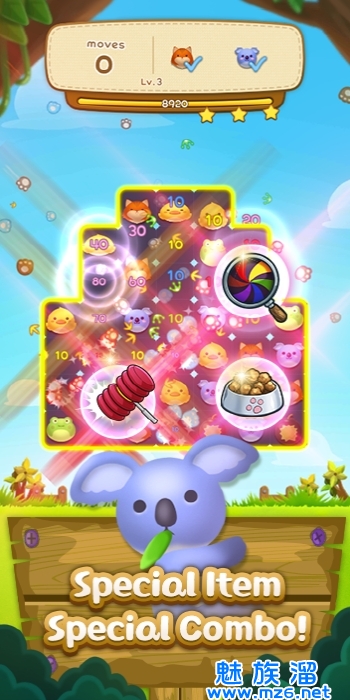 1、连接4个或以上的动物头像时,可以得到一个特殊的道具,可以清除垂直或是水平的所有图标;