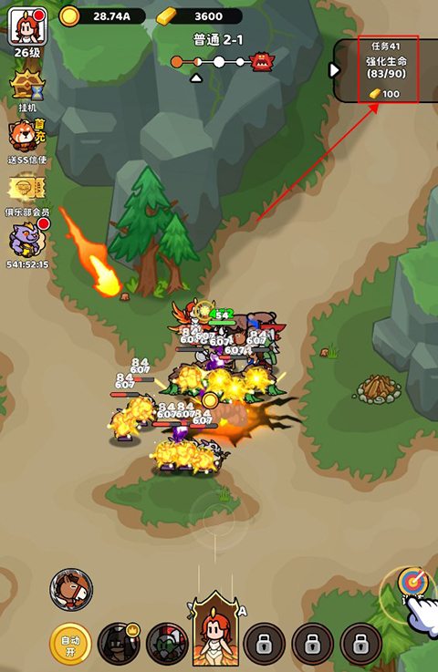 1. 这款游戏主打主线冒险,角色会自动战斗,玩家无需手动操作。玩家只需点击右上角的任务并完成,就能持续提升角色战斗力,顺利通过关卡,进而解锁更多趣味玩法。