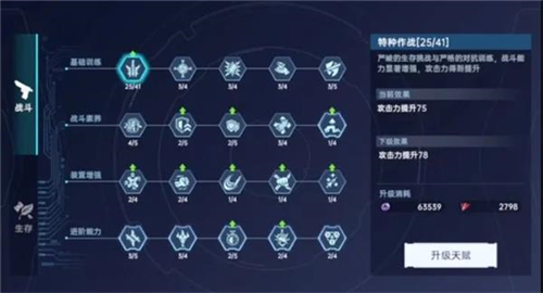 1、战斗天赋:首先是战斗天赋,这个重要的是基础训练,基础训练我们加的是第一个特种作战,第四个快速换弹,还有第五个精准射击。