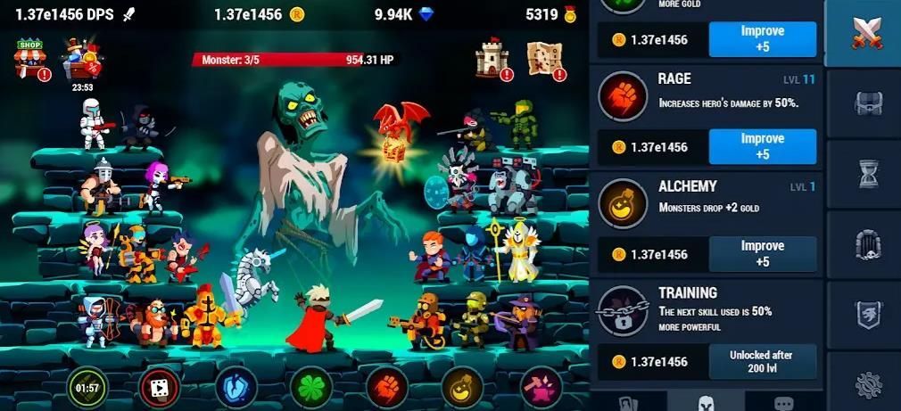 1、玩家需通过战斗杀死怪物获取金币和宝藏,用于升级英雄和装备。