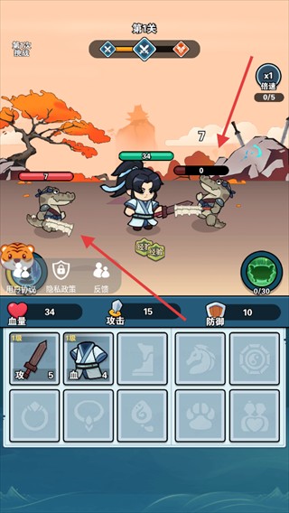 1、进入关卡自动战斗,装备【攻-5】【血-4】提升属性,应对鳄鱼怪积累经验。