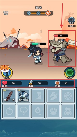 3、属性提升至【血量-36】【攻击-16】,攻击剩余【26】血量怪物,推进关卡。