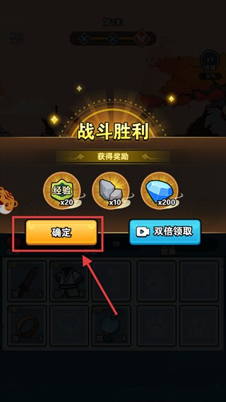 4、战斗胜利点击【确定】领【经验-乘20】【石头-乘10】【钻石-乘200】,积累资源提角色。
