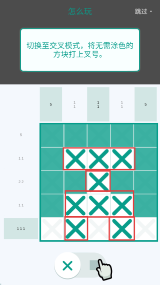 3、涂色区域完成后,切换交叉模式打叉,完成所有格子的填充即可。