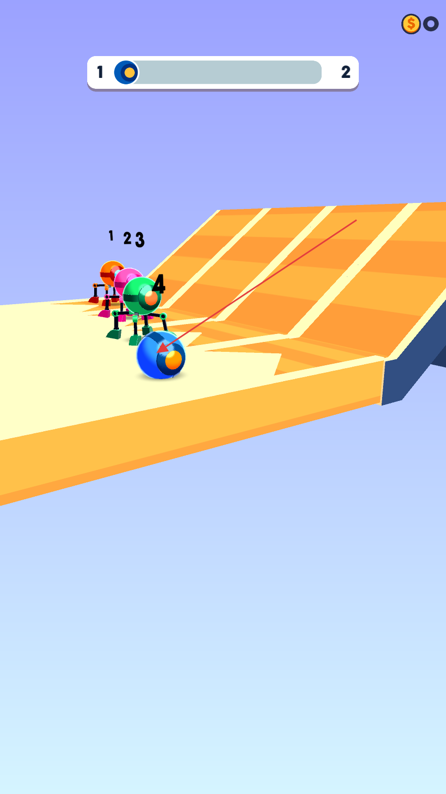 2、在赛道上,滑动屏幕操控蓝色角色沿路线滚动,抢占进度优势。