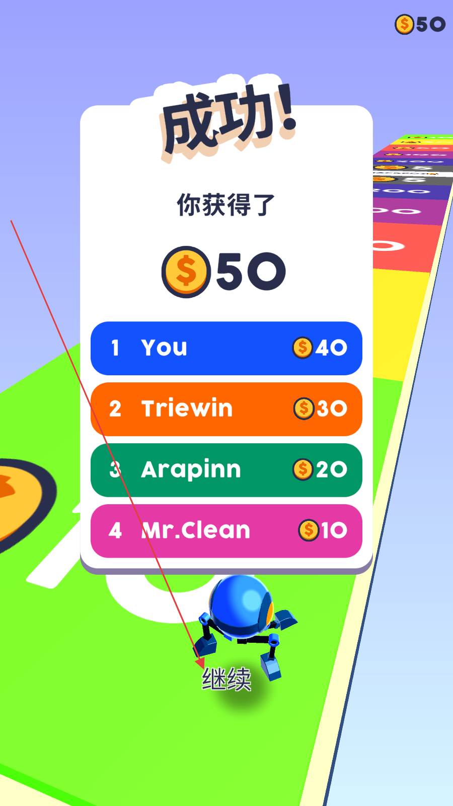 4、冲过终点后,点击【继续】,获取金币,解锁新关卡挑战。