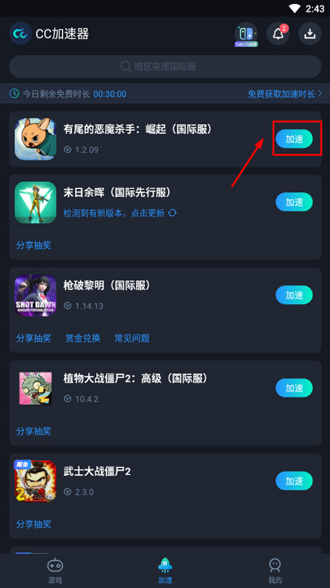 1、首先打开CC加速器,找到有尾的恶魔杀手崛起手游,点击右侧加速;