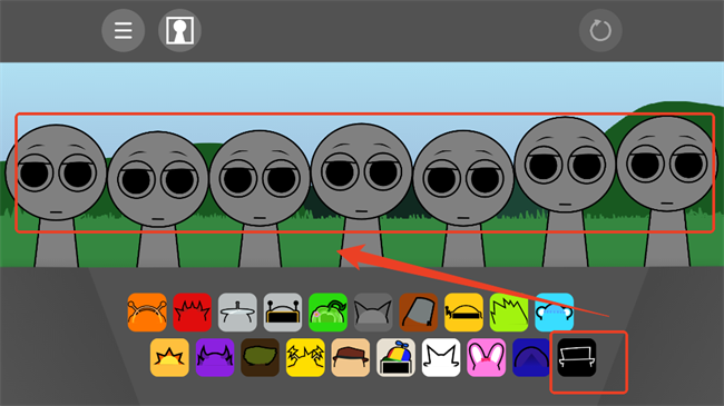 1.进入游戏后将右下角的黑色帽子拖放到上方任一人物当中