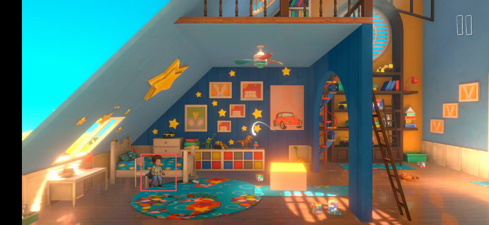 5、门后没有路,你需要将有羽毛的版块下滑到小女孩的地图右边,将其相连接