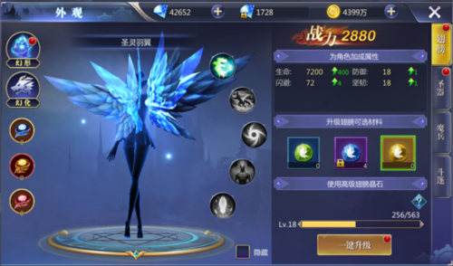 2、激活后,使用道具可对翅膀进行升级,升级可增加属性和战力