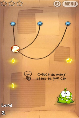 这个时候糖果飘向右边,生成第二条绳子,并吃到第二个星