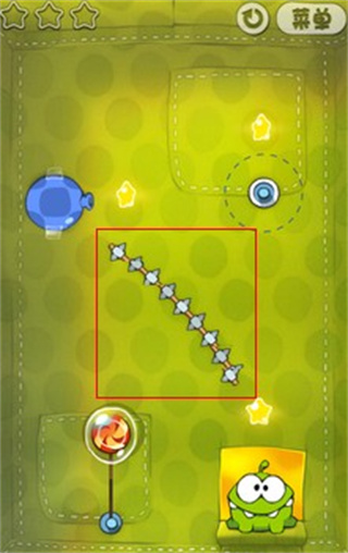 2,割掉上面的绳子,吃掉第一个星,挤左边的气球,让糖果飘向右边圈圈的时候割掉