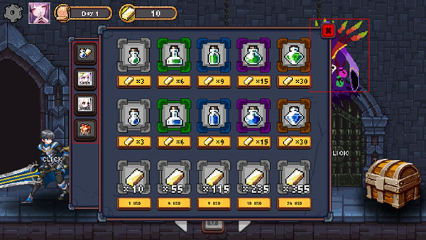 1、进入游戏,点击右上方漂浮魔怪可以购买各种药剂、角色和礼品,相当于商店;