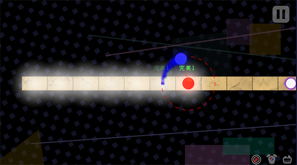 3、点击控制小球走到右边的圆圈里,开始时会有点难,跟上音乐的节奏来按,每次重音点击一下,会控制小球走直线。快半拍则是向上或者向下。