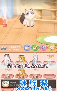 3、简单的挂机玩法,跟各种猫咪多多互动,能够加速它们的成长,合并生成更高等级。