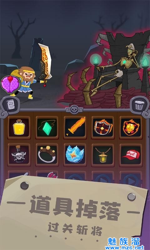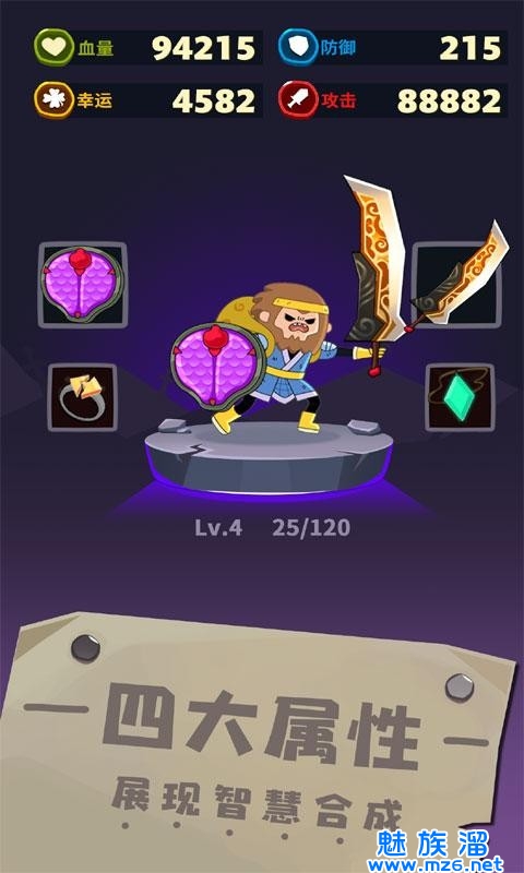 西行世界,妖怪横行,你再次踏上西行的征程,你除妖降魔,顺手从他们身上获得各种物品,然而你没有想到,这些物品竟然可以合成新道具……故事实在编不下去了,其实这就是合成打怪兽的游戏!有意思的是你可以收集各种奇异的武器和药水,来增强道具的能力,你需要分别提升自己的攻击力、防御力、生命值、幸运值.然后去战胜小妖怪,其中给武器附上冰、火元素,还可以对相克的妖怪产生额外的成倍伤害.游戏超级简单但又考验你的合成小策略。