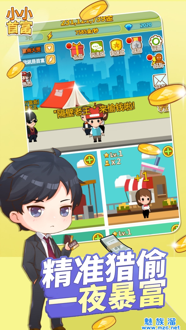 要当上首富,单靠自己的赚钱怎能满足,就不想去土豪家里捞一把?当秒入超过6000金后,可以开启《小小首富》里面的猎偷功能,可以在交流区或者排行榜里面点击随便一个人进行猎偷金币。