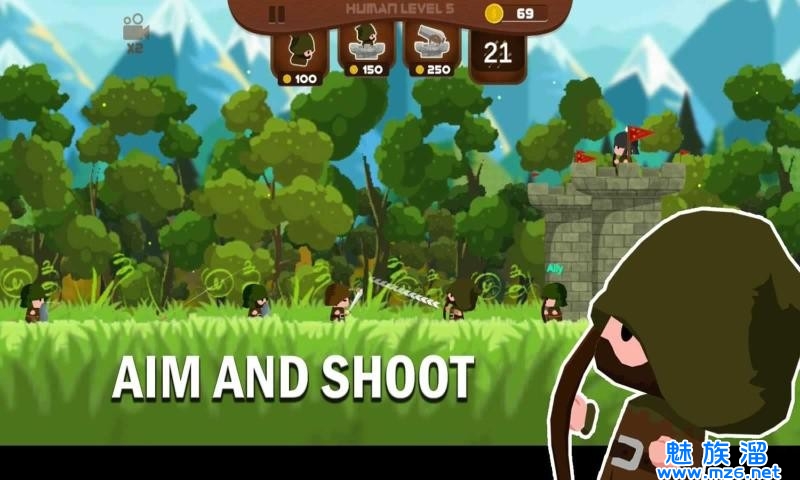 当战场上只有你一名弓箭手时,你该如何守护城池?滑动屏幕瞄准方向,射击!你需要将源源不断的敌人一一击倒,优秀的物理飞行提高了你射击的难度!击倒敌人,获取金币,雇佣士兵,努力抵御敌人进攻吧!