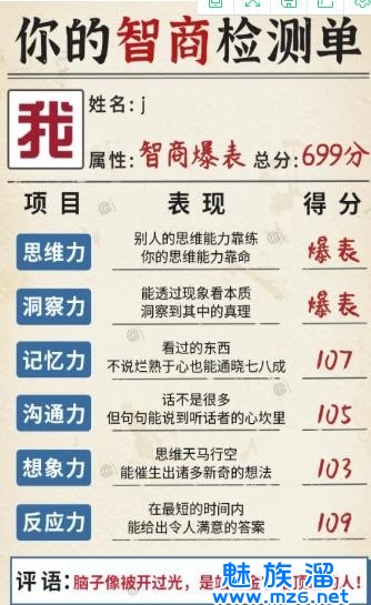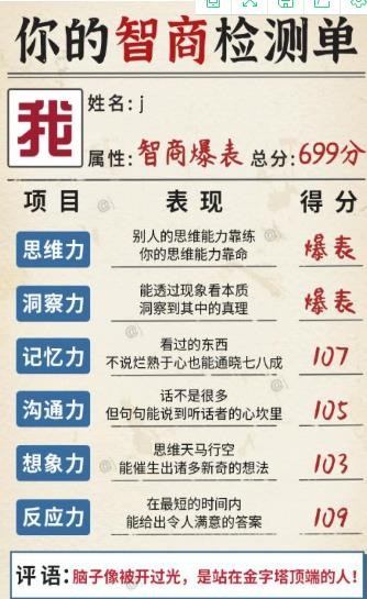 在这款游戏中,玩家可以通过回答诸多问题,来获取一份七情检测成绩单,游戏仅供娱乐不必太过在意,游戏的玩法很简单,只要选择你想要的答案,最后就会自动生成成绩单,上面会详细描述你的智商状况。