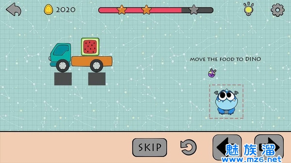 游戏的目标是把好吃的食物移到恐龙区前面。你有一辆卡车,你的手指和 大脑。