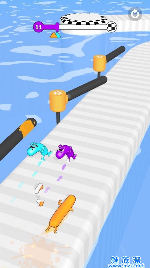 2.奔跑的同时,指尖灵活的操控,去躲避那些出现的障碍墙,避免被推下水;