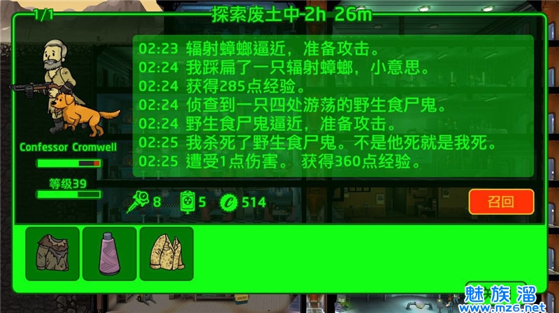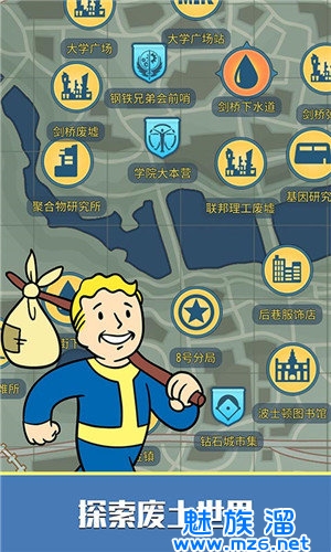 2.探索废土派遣您的居民到地面上,去探索被炸毁后的地面废墟,让他们在“废土”中冒险,寻找可用的幸存物,或是直面无言的死亡;找到新的装甲和武器,增长经验,然后赚取“瓶盖”。但记住,不要让他们死掉!