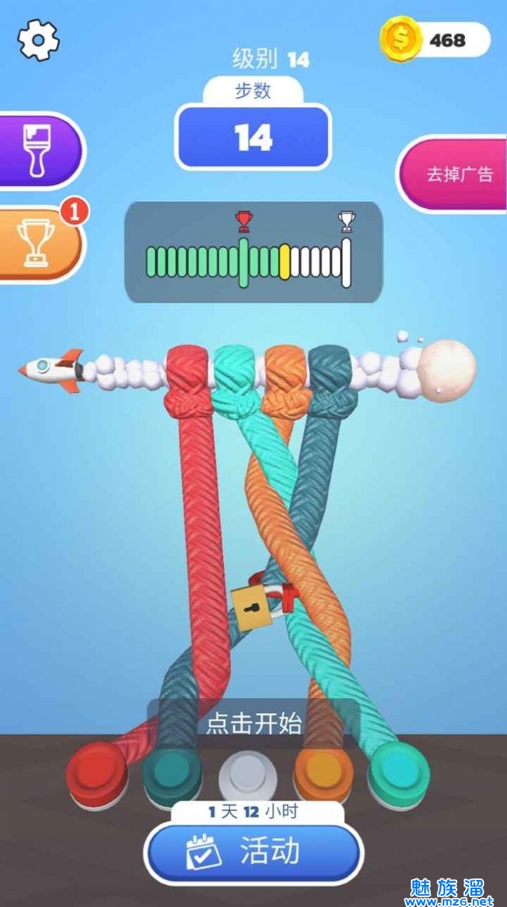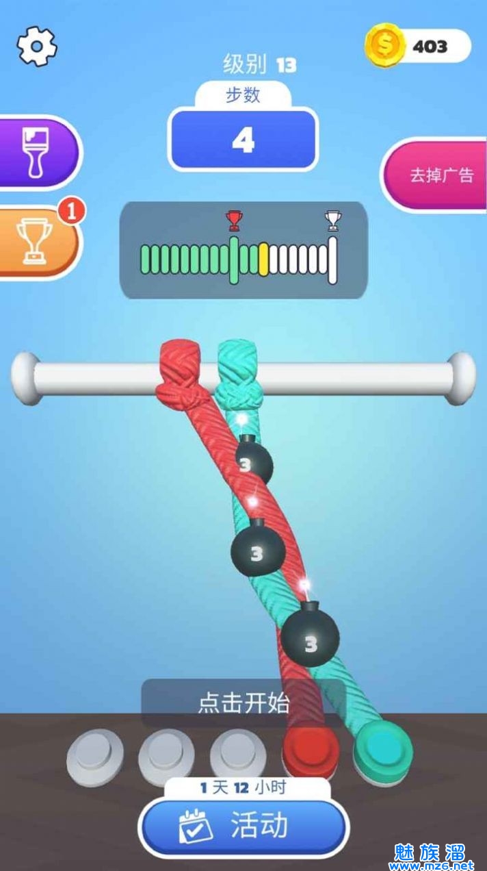 3、一个个的关卡绳结的模式,后面的难度逐渐的加大,每天签到会有红包的奖励给你使用。