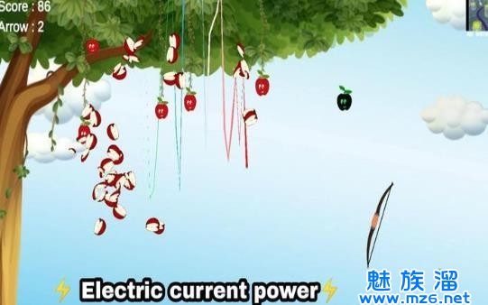 1、在游戏中,玩家将要用手里的弓箭去射击苹果,值得注意的是,一定不要射击黑苹果。