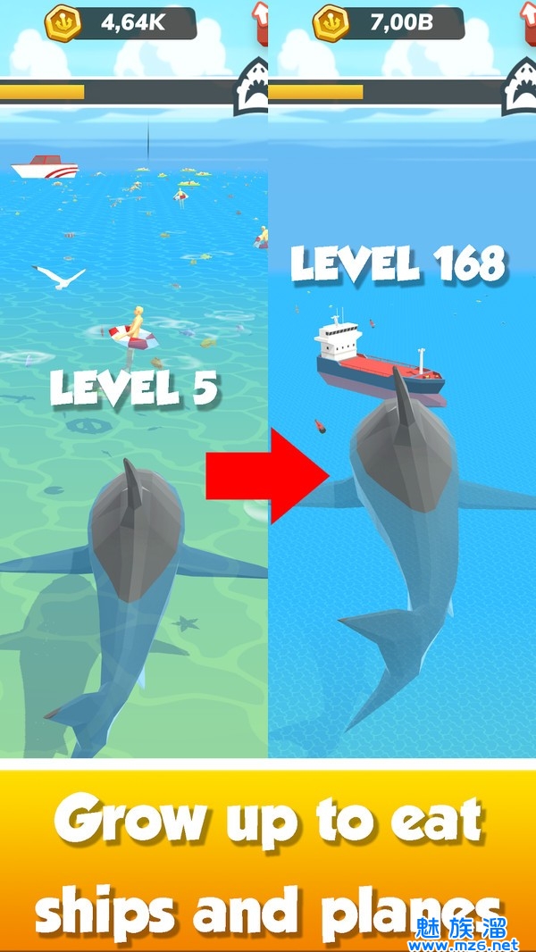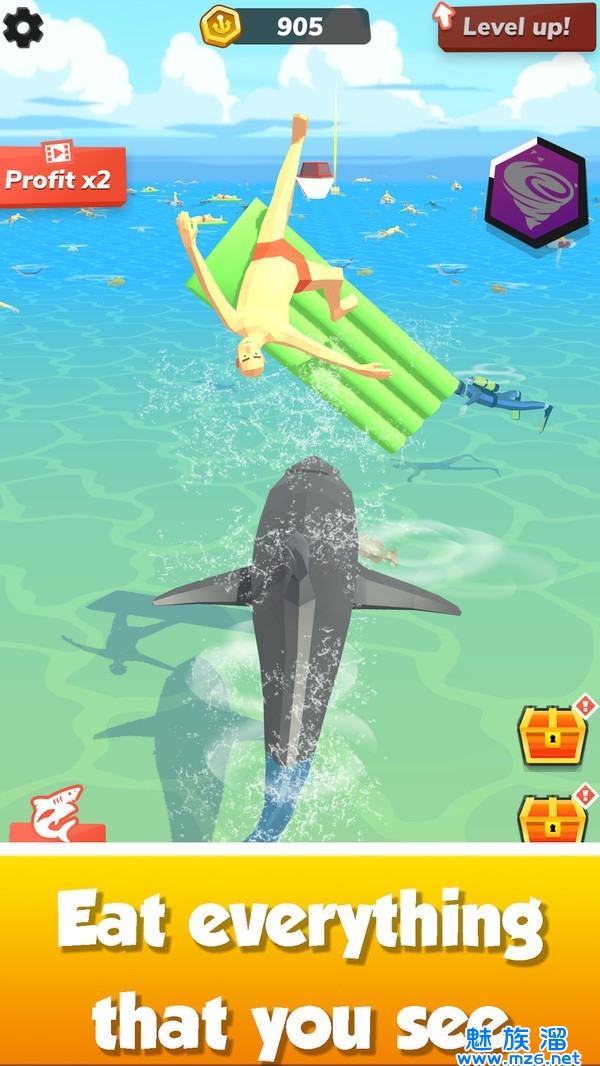 2、控制饥饿的白鲨,前往海洋,通过吃掉路上的所有食物来提高技能!