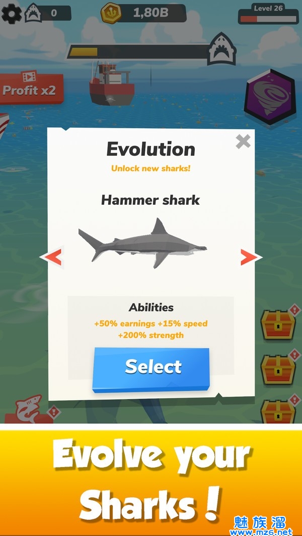 1、欢迎来到鲨鱼世界!这是一款带有鲨鱼模拟器元素的奇妙的空闲游戏。
