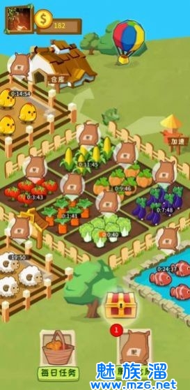 1、画面设计十分亮丽清新,轻松放置的玩法,开始经营你的农场,灵活去管理;