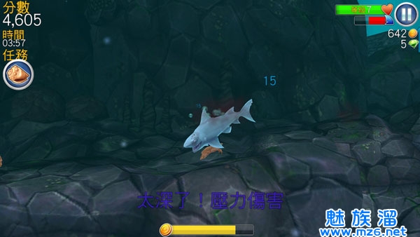游戏中的贝壳都在石头上边,所以前期我们先尽可能的去收集贝壳,获得任务,收集更种道具,获得相应的奖励。尽快发育获得后边更强的大鲨鱼,前期尽量在海面上方游走,因为我们承受不住海低的压力,如果我们潜入一定深度后,就会有提示,如下图所示: