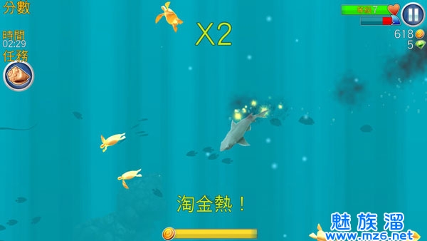 游戏中我们可以通过一只手控制它前进的方向,同时在按住屏幕,鲨鱼就会加速前进,这样就可以吃到更多的鱼了。右上角绿条是你的饥饿度,当他没有的时候,你就会GG,红色代表的是你的咬力,这对我们无关紧要,旁边的按键是暂停键,以供我们有事的时候可以保持状态,右边显示的是我们的金币和砖石,左边有分数,贝壳是人物,但是必须收集游戏里的贝壳来解锁相对应的任务,中间下边的黄条是进入淘金热的距离,当黄条满了,就进入淘金热,在这个状态下我们是无敌的而且吃到的所有生物都是金币,非常爽,游戏中吞食人类的画面比较血腥,我就不截图了。