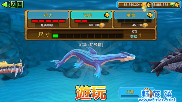 通过游戏中我们控制的鲨鱼获得金币与砖石,我们可以升级图示中的咬住、速度、加速,这些属性,使我们获得更强的战斗力。移动屏幕可以看到后边的鲨鱼,可以通过金币和砖石去购买,越到后边的鲨鱼,杀伤力越大,到了你就是食物链的顶端,连炸弹都不必怕,但是随着鲨鱼的增大,它的饥饿度掉的更快,这就需要我们不停地去吃。