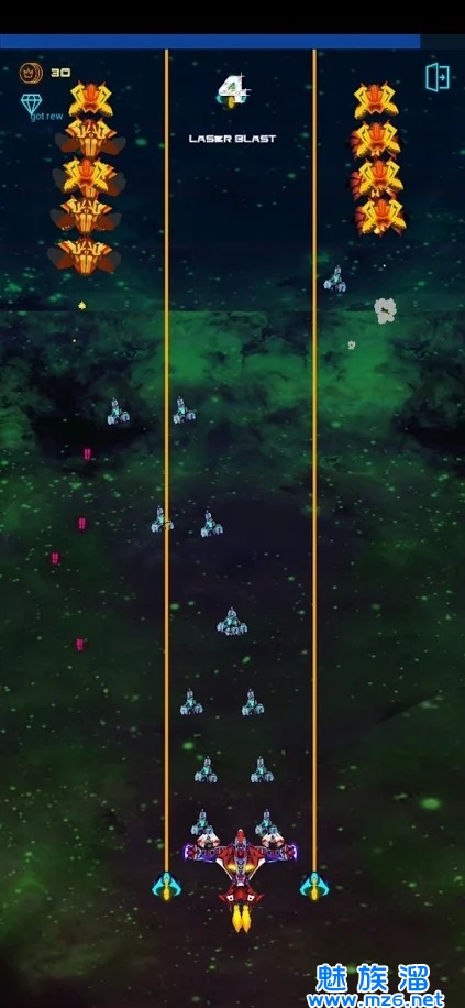3、使用金币和钻石升级你的飞船,与敌人、首领和外星入侵者战斗。