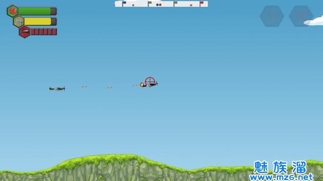 2.飞行中注意避免被敌人攻击,如果敌人的炮弹击中你的飞机,它们会直接爆炸;