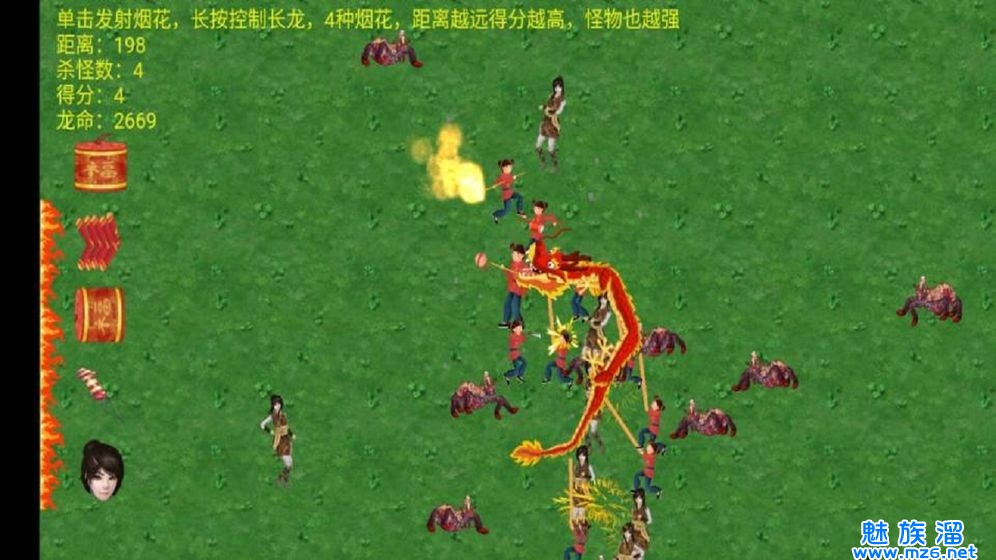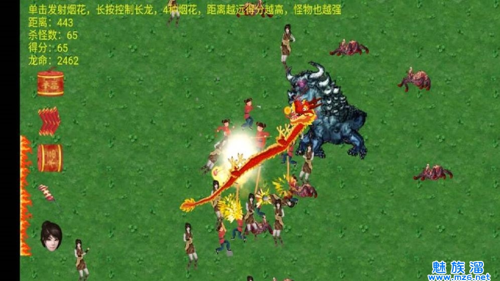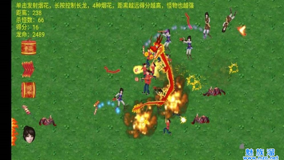 舞龙大师是一款非常好玩的休闲闯关游戏,玩家控制场控点击屏幕来发射烟花攻击怪物,操作简单十分的有趣,画风虽然十分的简约但是却很耐玩,灵活的利用策略来杀死怪物,多种烟花可以选择,拥有不同的威力,招募烟花手来帮助你攻击怪物,不断的战斗来获得更高的分数,感兴趣的小伙伴快来下载试试吧。