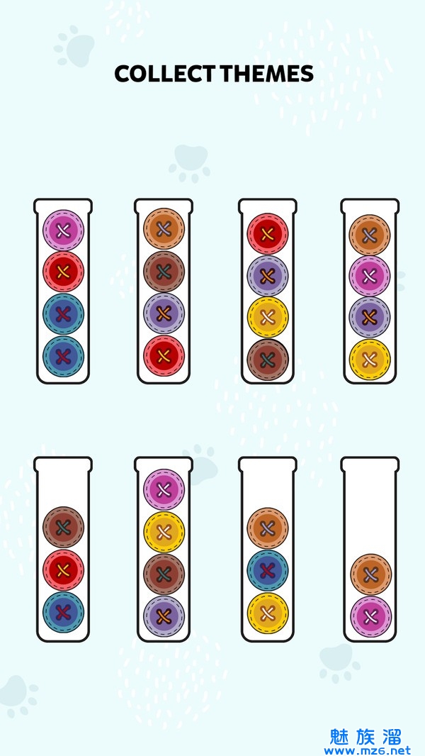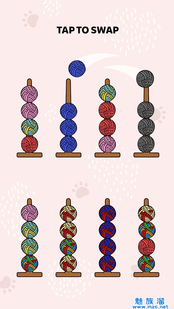毛球排序游戏。休闲打发时间必备神器,该游戏有着一定的减压休闲感,在游戏中有很多不同的毛球,玩家需要将它们进行排序,而排序的方式就是毛球的色彩,相同的色彩就放在同一排,让所有的毛球看起了非常美观,非常具有挑战的休闲游戏,关卡越高毛球数量越多,赶快试试吧!