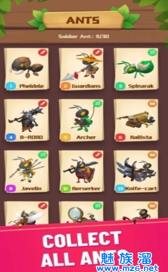 2、自由训练升级你的蚂蚁军队,搭配自己的阵容,将森林中的怪物全部击败。