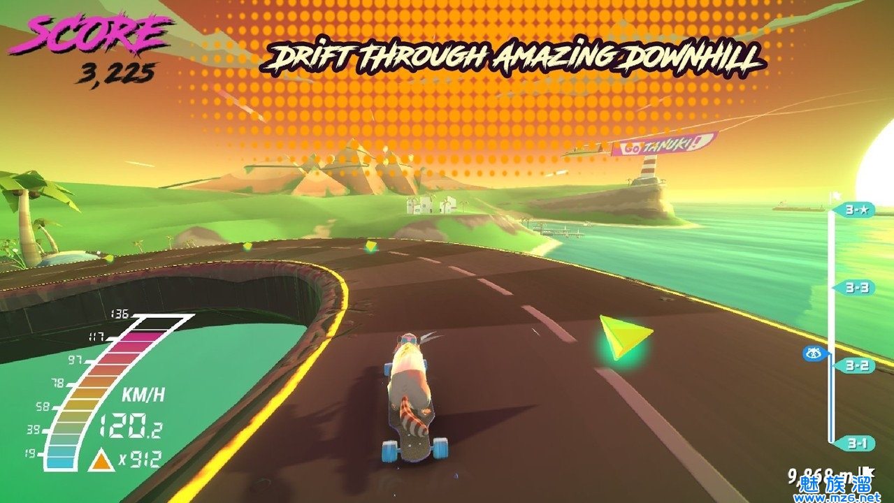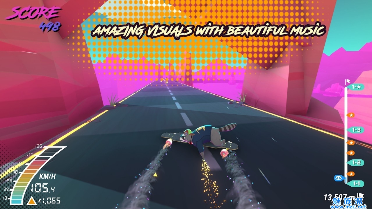 1、掌握长板漂流,从山脉到整个城市,尽享复古波浪风格和令人震撼的合成波音乐声轨的美感;