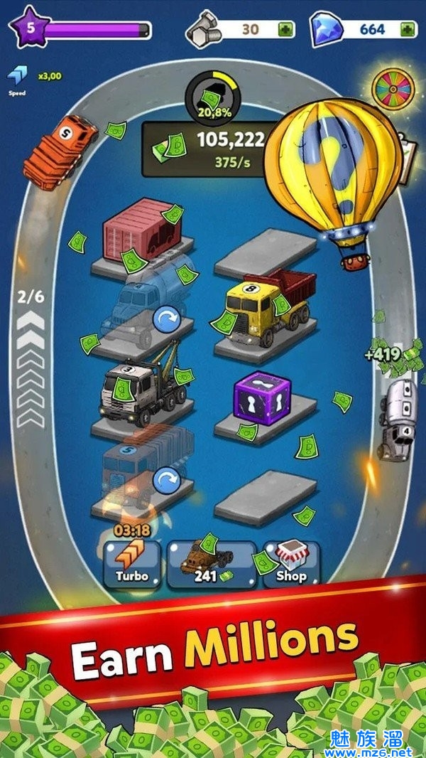 1、车速表演挂机也能升级车辆,合成模式来完成竞速任务,旅途中能让你收获无数的财富。